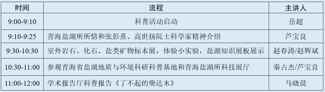 活动围绕盐湖科学知识和科学家精神教育展开,内容包含“青藏高原盐湖演化、盐湖成盐成矿过程、盐湖资源勘查与利用、微观世界中的盐湖、盐湖旅游资源和生物资源、盐湖与人类生活、盐湖科学家及科学家精神”展开,由不同专业的一线科研工作者现场讲解?;疃才湃缦拢?/p>